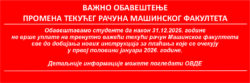 Обавештавају се студенти да ће све уплате на тренутно важећи текући рачун Машинског факултета број 840-1876666-10 бити могуће закључно са 31.12.2025. године. Након 31.12.2025. године овај број текућег рачуна неће бити у функцији због преласка у систем СПИРИ (Систем за припрему, извршење, рачуноводство и извештавање) Молимо студенте да не врше уплате након 31.12.2025. године на наведени број текућег рачуна Машинског факултета све до добијања нових инструкција за плаћање које се очекују у првој половини јануара 2026. године. опширније…