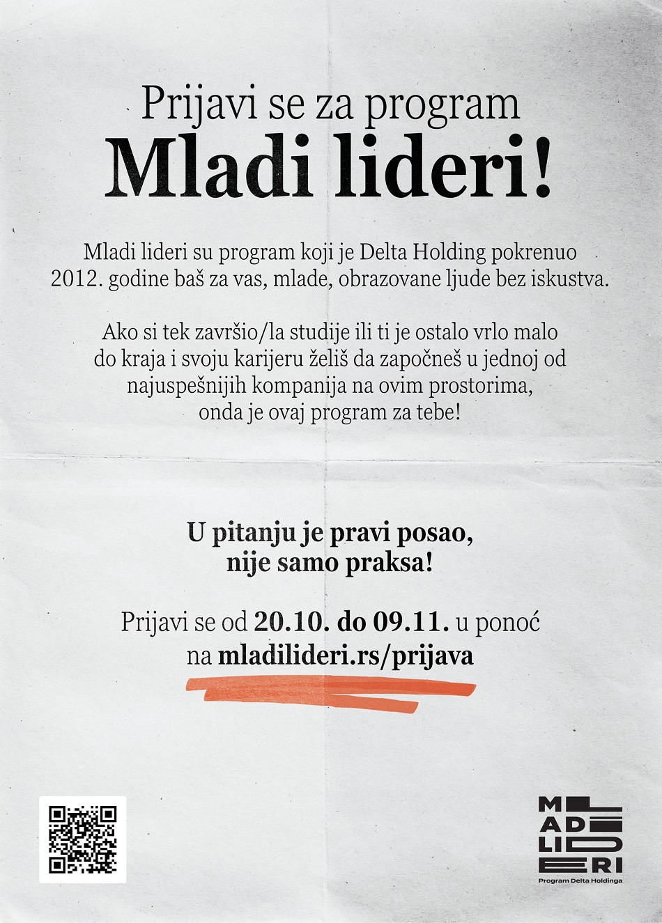 Компанија Делта Холдинг отворила је конкурс за 14. генерацију полазника програма Млади лидери. Овај програм је усмерен на младе таленте који су при крају студија или су недавно дипломирали и желе да започну своју каријеру у корпоративном свету.