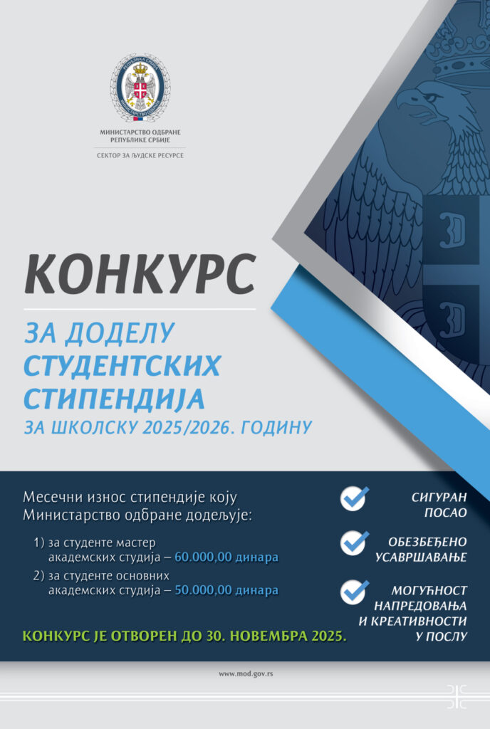 Представници Министарства одбране Републике Србије представиће заинтересованим студентима Машинског факултета актуелни конкурс за доделу студентских стипендија за потребе Војнотехничког института, у школској 2025/2026. години. Промоција конкурса биће одржана у среду, 05. новембра у сали 211/II, са почетком у 13 часова.
