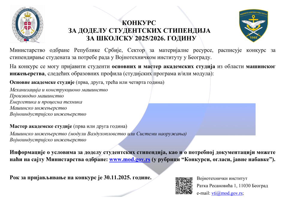 Министарство одбране Републике Србије, Сектор за материјалне ресурсе, расписао је конкурс за стипендираље студената за потребе рада у Војнотехничком институту у Београду.