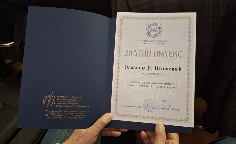 Машински факултет у Београду је ове године, у оквиру облежавања 77 година постојања, по први пут приредио доделу Златног индекса својим некадашњим студентима који су факултет уписали пре пола века. Овај догађај окупио је генерацију инжењера која је свој академски пут започела, давне 1975. године. Та генерација, како је истакнуто, оставила је дубок траг у техничком развоју земље.