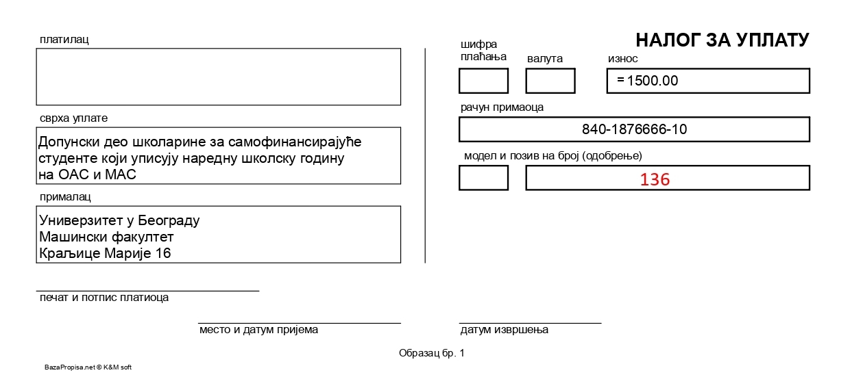 г) само за самофинансирајуће студенте доказ о уплати за допунски део школарине за У.Б. (пример уплатнице)